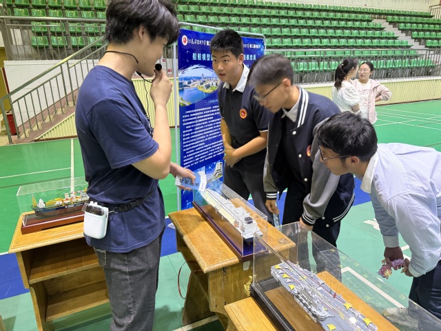 此次江科大展区以航海科技为核心,辽宁舰、福建舰、055型驱逐舰、LNG运输船等多艘精品船模集中亮相,涵盖国防舰船与民用海洋装备领域,模型细节精致、特色鲜明,直观呈现了我国在国防舰船与民用海洋装备领域的发展成就。材料学院师生化身“科普讲解员”,围绕船模的设计原理、材料应用及航行特性展开细致解读,将抽象的专业知识转化为生动的科普内容,吸引大批学生驻足观察、提问交流,直观感受海洋科技的魅力。