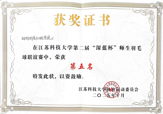 喜迎我校办学92周年之际,为进一步厚植校园文化底蕴、丰富师生课余生活,大力推广全民健身理念,深入落实国家体重管理年活动部署,学校于2025年10月11日至12日举办第二届“深蓝杯”师生羽毛球联谊赛。此次比赛共20个队伍参赛,材料学院作为参赛队伍之一,积极备战,最终取得第五名的优异成绩。