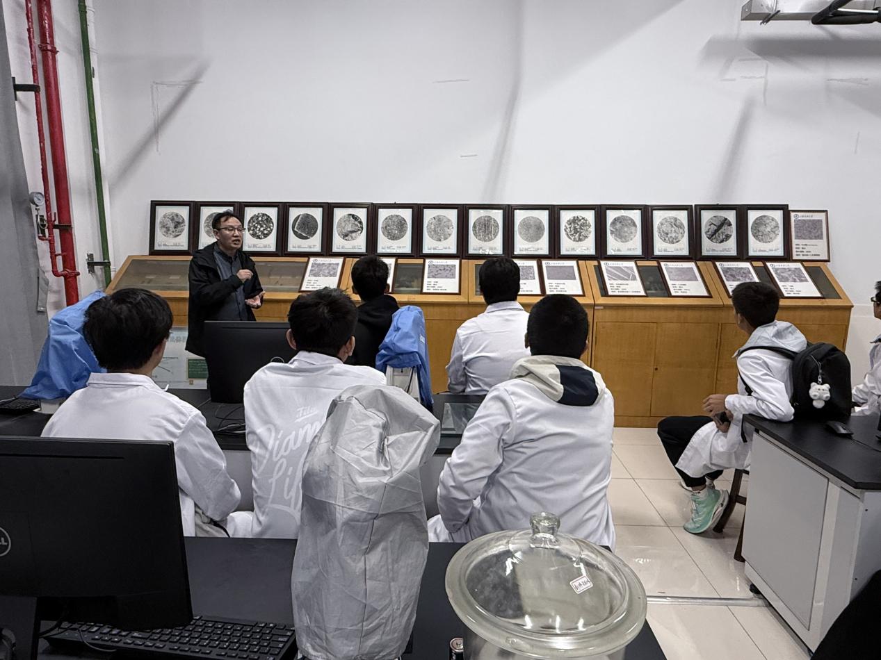 金属实验室里,徐玲利老师带领新生逐一参观材料制备、力学性能测试、金相分析等功能区域,涵盖铸造实验室、化学热处理实验室、应力腐蚀实验室、抛光室、金相显微镜观察实验室等。徐老师不仅详细介绍了各实验室的功能定位,阐述金属材料在现代工业与前沿科技中的重要地位,还现场完整演示了金相观察全过程 —— 从试样制备、抛光腐蚀到显微组织观察,每一步操作都细致讲解。新生们分批次有序入场,严格遵守实验室安全管理规定,认真聆听讲解并主动提问,与老师展开积极互动,在交流中深化对专业的理解。