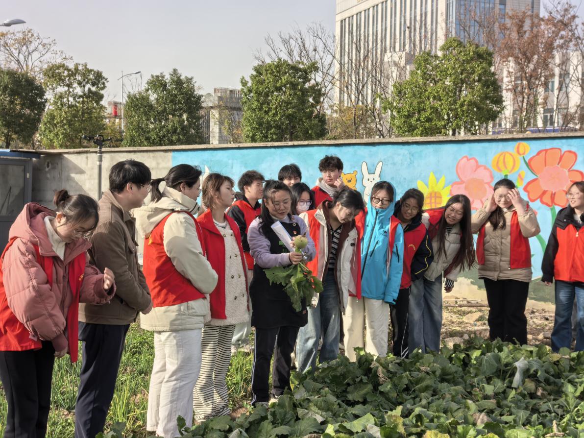 随后开展的“拔萝卜”环节将气氛推向高潮。在任老师指导下,党员和团员们踊跃下地,亲手将一个个沾着泥土清香的萝卜拔出。手捧劳动成果,大家脸上洋溢着收获的喜悦。紧接着,同学们分工协作,清洗、切片、装盘,共同分享这份新鲜的劳动果实。清脆的咀嚼声与欢声笑语交织在一起,大家在品尝甘甜的同时,深刻体会到“劳动创造价值”的真谛,也感受到校园集体生活的温暖与融洽。