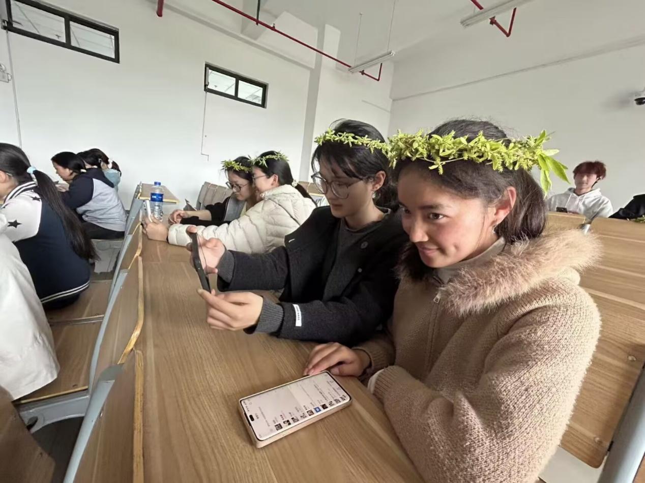 活动转入传统文化体验环节。同学们亲手折取柳枝,寄托祈福安康的美好心愿。大家发挥创意,将柳枝编织成柳帽,并搭配野花与彩纸进行装饰,在实践中体悟清明插柳、戴柳的传统习俗。
